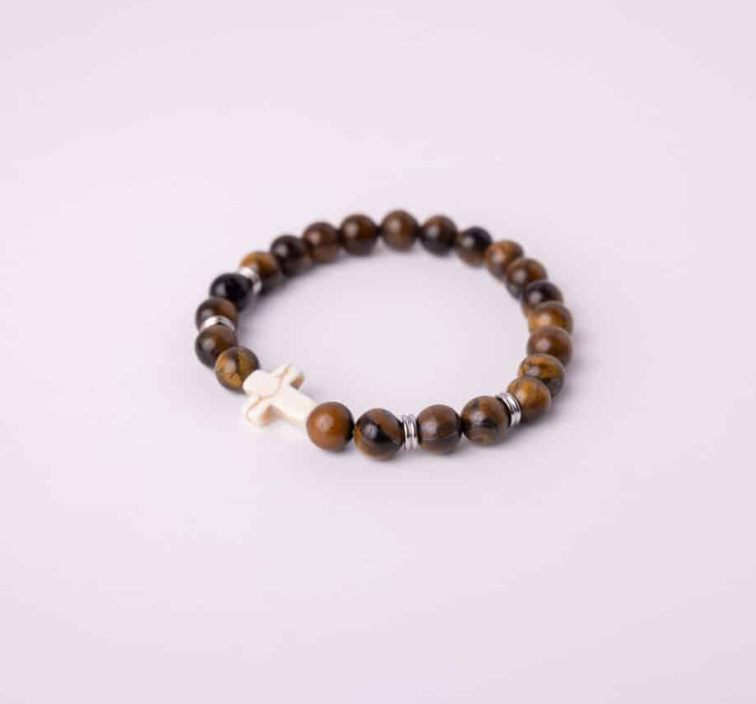 Carry a reminder of courage and faith with this handcrafted bracelet featuring natural tiger’s eye stones and a white cross accent. The rich brown and golden tones of the tiger’s eye symbolize strength, confidence, and protection, while the cross centerpiece represents unwavering faith. Each bead is strung on a durable stretch cord for a comfortable, easy fit — perfect for everyday wear or gifting to someone special.